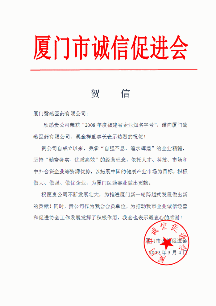 廈門市誠信促進會賀信