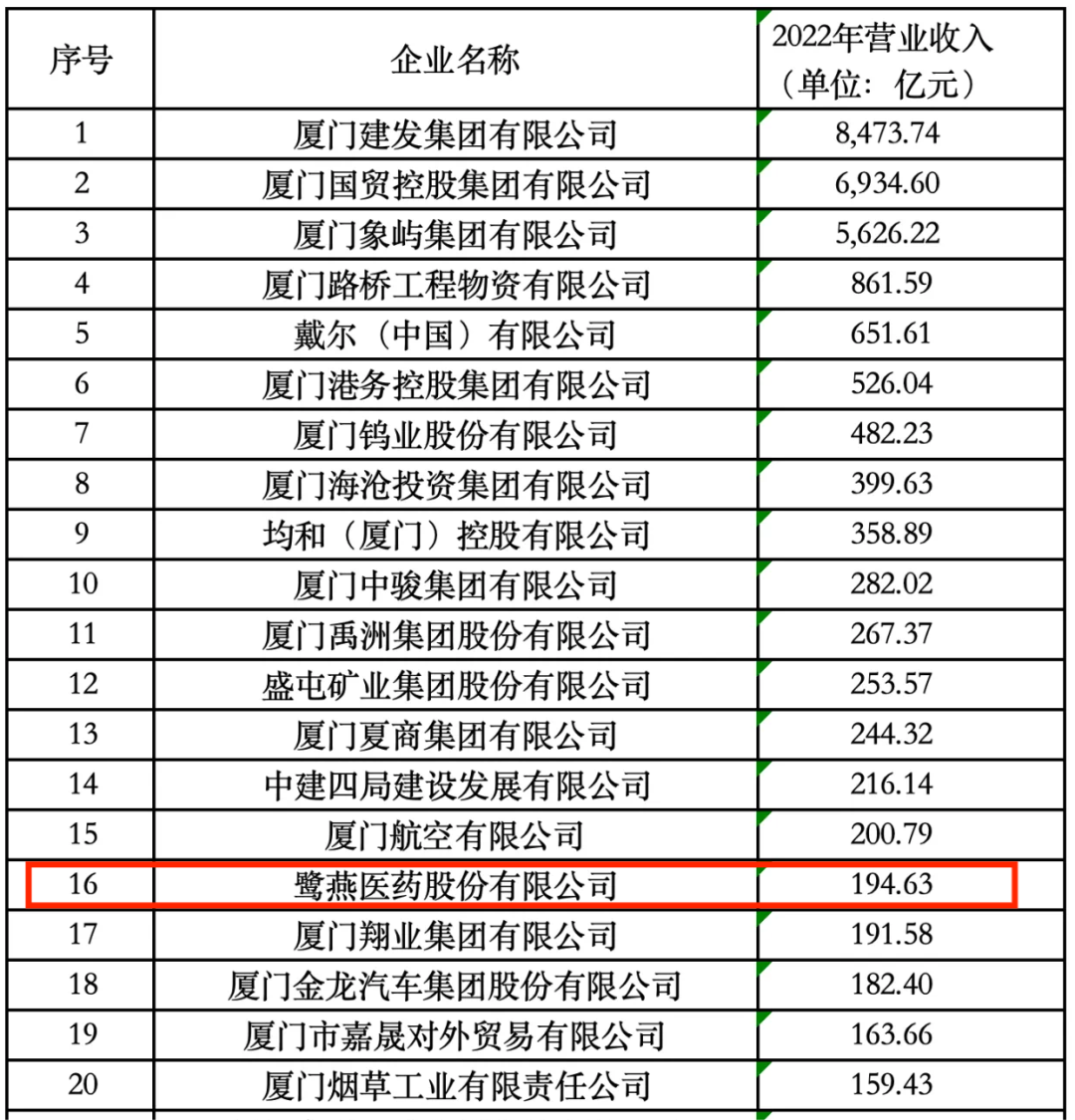 2023年11月25日,廈門企業(yè)和企業(yè)家聯合會發(fā)布2023廈門企業(yè)百強榜單,鷺燕醫(yī)藥股份有限公司榮列第16位!