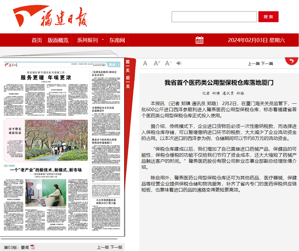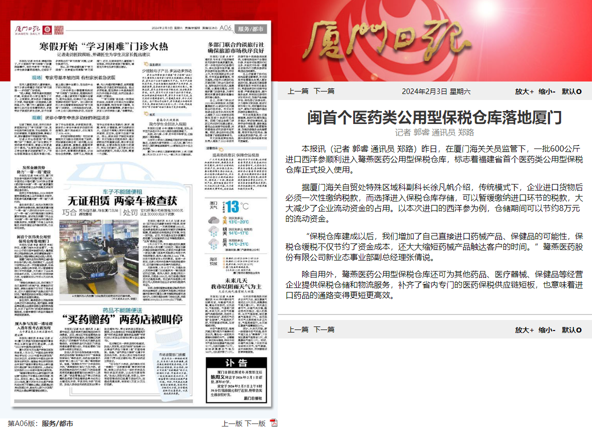 2024年2月2日,鷺燕醫(yī)藥公用型保稅倉獲批投用,《福建日報》《廈門日報》相繼報道相關(guān)新聞。鷺燕醫(yī)藥公用型保稅倉是福建省首個醫(yī)藥類公用型保稅倉庫,該保稅倉庫的投用,意味著廈門市乃至福建省補(bǔ)齊了區(qū)域內(nèi)專門的醫(yī)藥保稅供應(yīng)鏈物流服務(wù),也意味著廈門和福建進(jìn)口藥品的通路變得更短,更為高效。