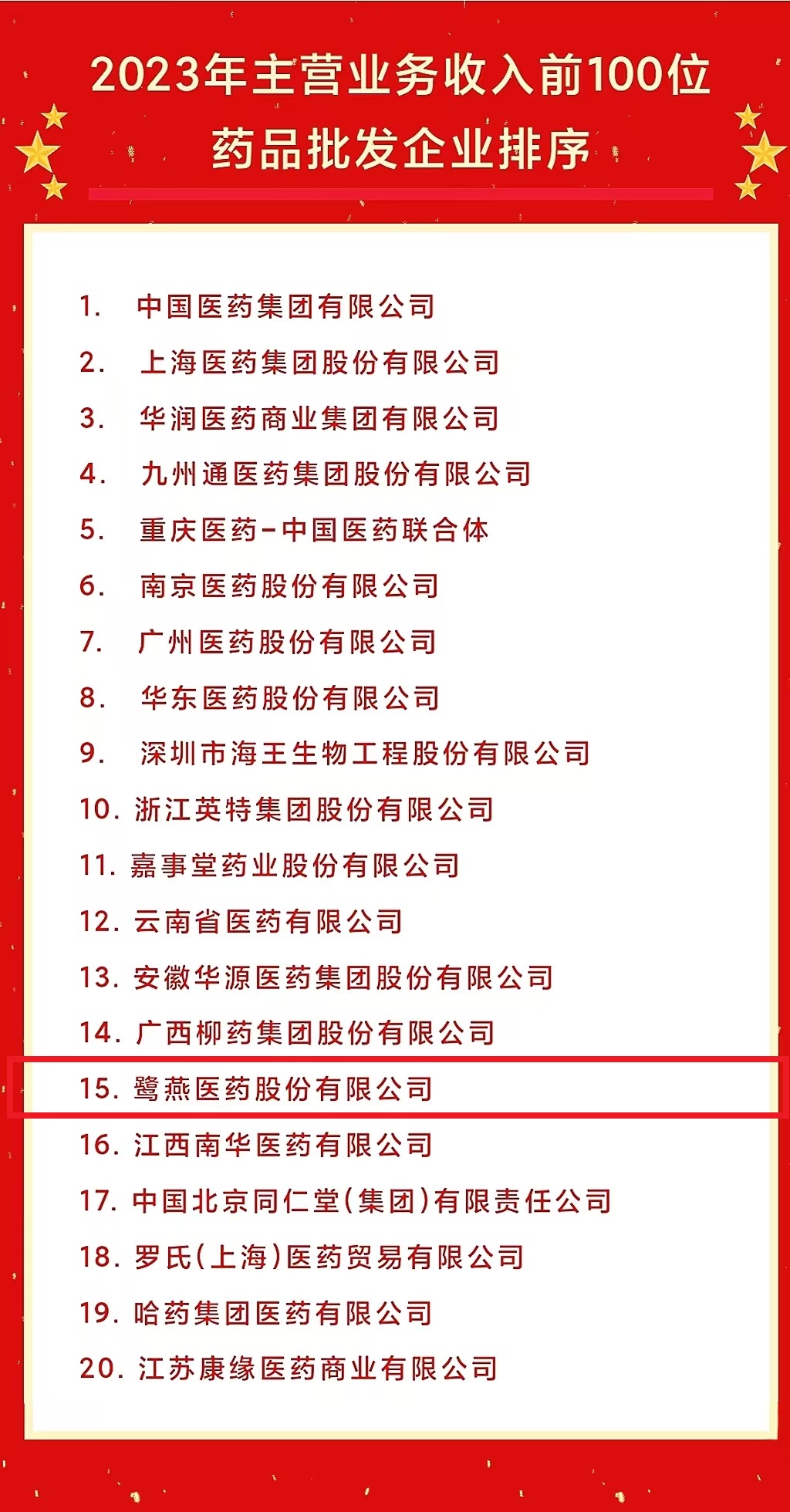 鷺燕醫(yī)藥榮登2023年藥品批發(fā)企業(yè)主營業(yè)務收入第15位!