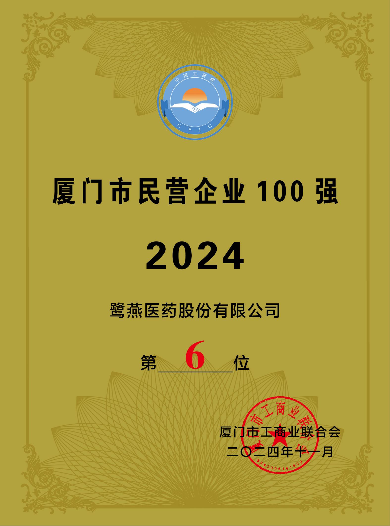 2024年廈門企業家日大會于11月1日召開,會上發布2024廈門市民營企業100強榜單、2024廈門市民營企業服務業20強榜單。鷺燕醫藥榮登2024廈門市民營企業100強榜單第6位,2024廈門市民營企業服務業20強榜單第4位!