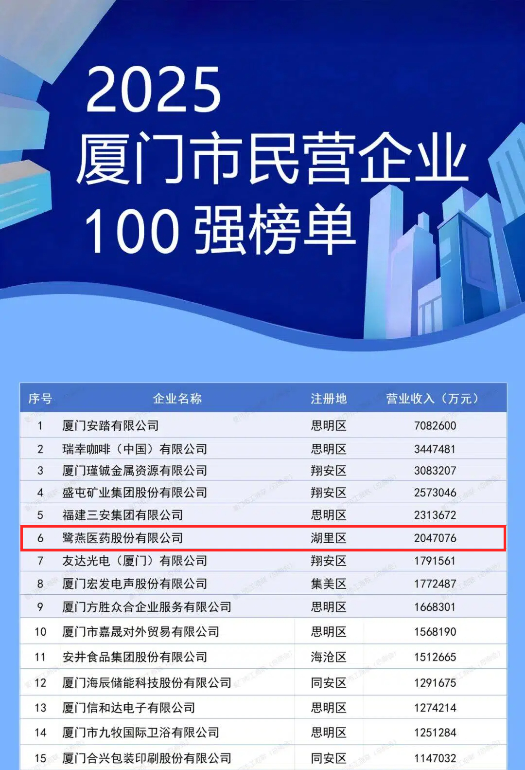 【喜報】2025廈門市民營企業100強系列榜單發布 ——鷺燕醫藥再獲兩大殊榮