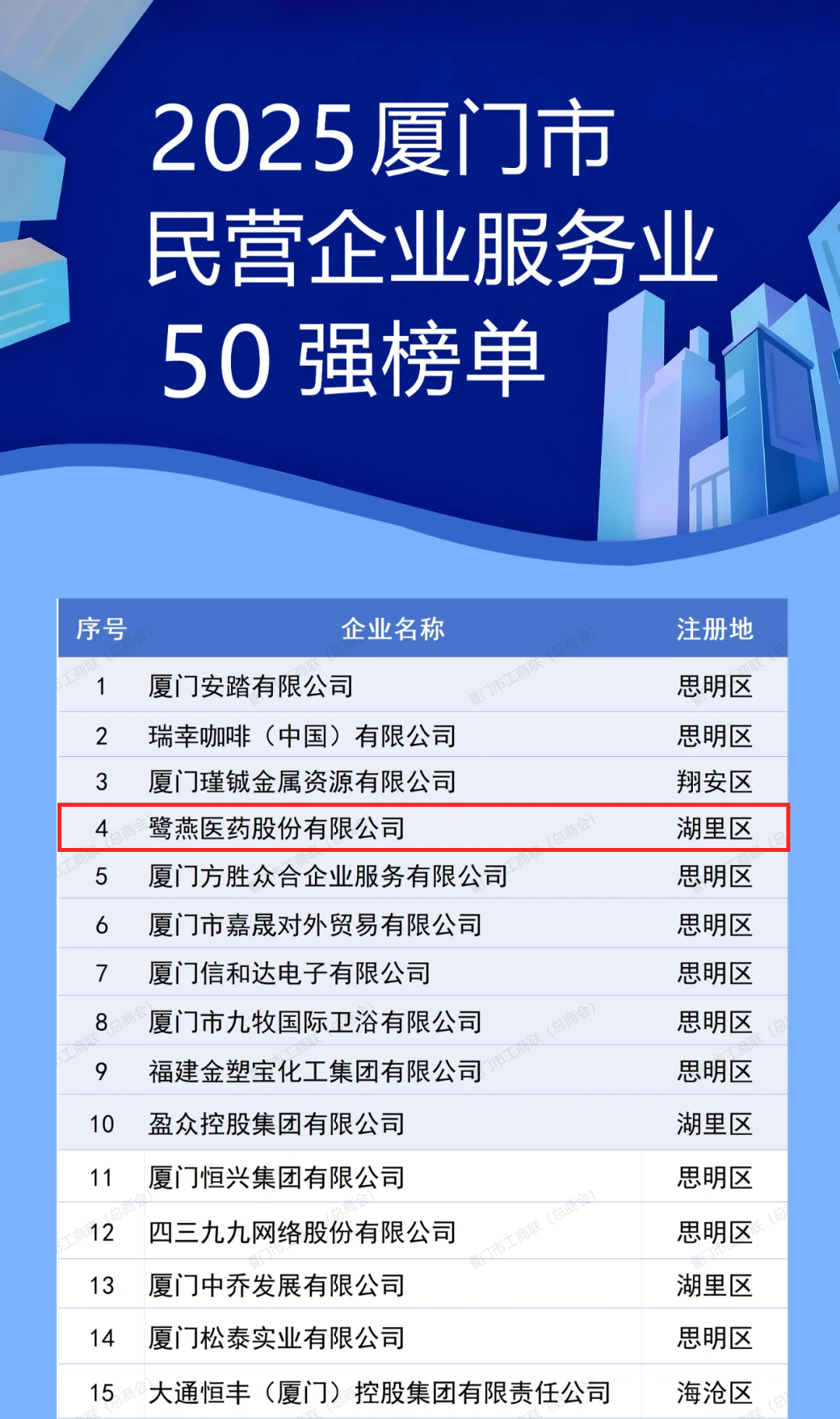 11月1日上午2025年廈門企業家日大會召開。大會發布了2025廈門市民營企業100強系列榜單,介紹了廈門市民營經濟發展態勢和營商環境建設成效。鷺燕醫藥股份有限公司憑借上市企業綜合實力,榮膺2025廈門市民營企業100強6以及2025廈門市民營企業服務業504