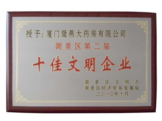 廈門鷺燕大藥房有限公司于2010年10月被廈門市湖里區文明辦、廈門市湖里區經濟貿易發展局評為湖里區第二屆“十佳文明企業“榮譽稱號。