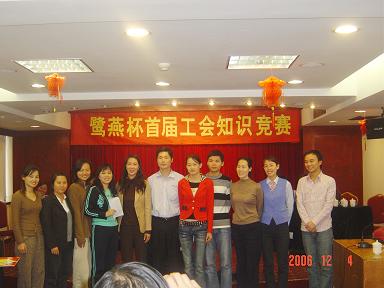 廈門(mén)鷺燕大藥房有限公司于2006年12月3日在廈門(mén)廬山大酒樓隆重舉行鷺燕杯首屆工會(huì)知識(shí)競(jìng)賽,此次工會(huì)知識(shí)競(jìng)賽由6個(gè)工會(huì)小組各自選派4名選手參加,比賽環(huán)節(jié)包括團(tuán)隊(duì)介紹、啦啦隊(duì)互動(dòng)、演講比賽、必答題、搶答題、猜詞秀、才藝表演等,形式多樣、內(nèi)容豐富。比賽現(xiàn)場(chǎng)還邀請(qǐng)了一些供應(yīng)商的代表作為嘉賓評(píng)委,為比賽進(jìn)行現(xiàn)場(chǎng)點(diǎn)評(píng)及頒獎(jiǎng)。